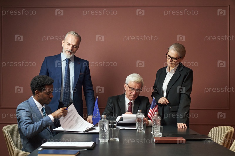 Политики среднего возраста ведут переговоры по международному соглашению за конференц-столом