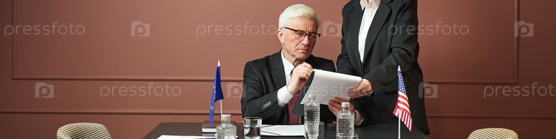 Мужчина обсуждает документы с молодой взрослой женщиной за столом заседания