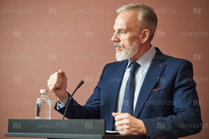 Человек среднего возраста выступает на подиуме во время политического мероприятия