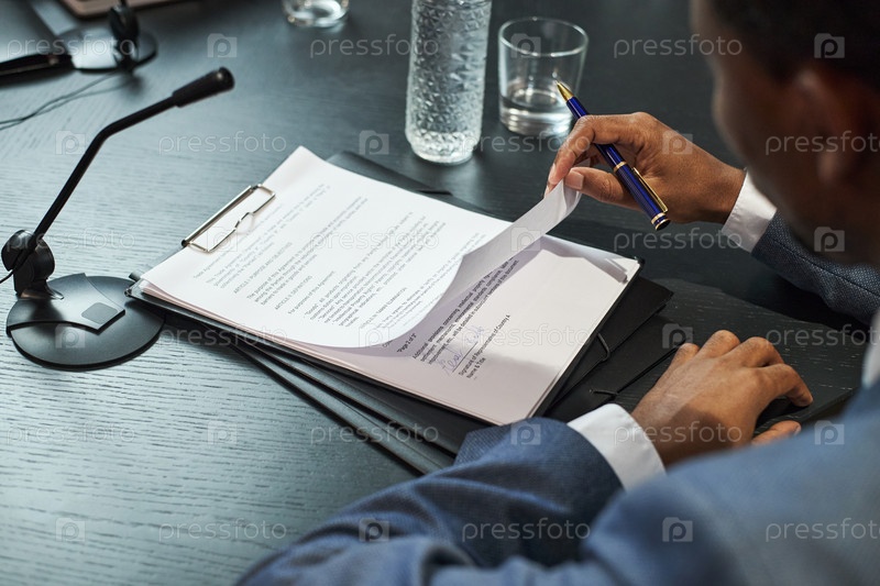 Чернокожий мужчина средних лет просматривает документы во время политической встречи за рабочим столом