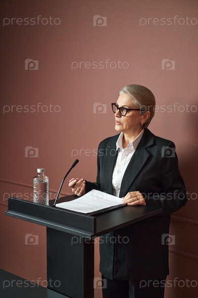 Женщина-старший политик, выступающая на подиуме во время пресс-конференции