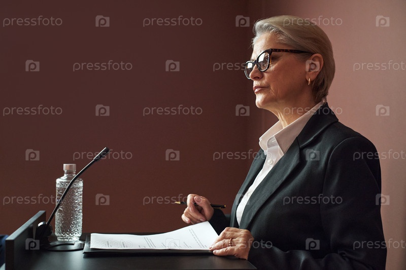 Женщина-старший политик, выступающая на подиуме во время конференции