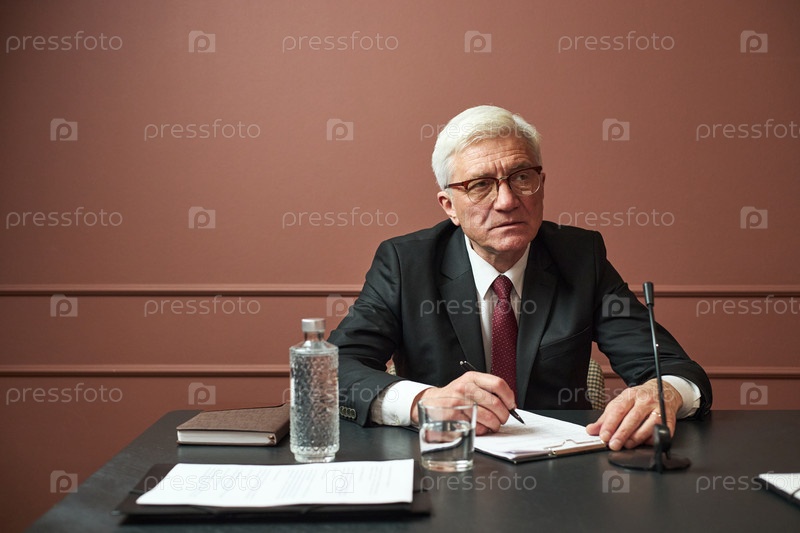 Старший человек пишет заметки во время политической встречи при конференц-столе