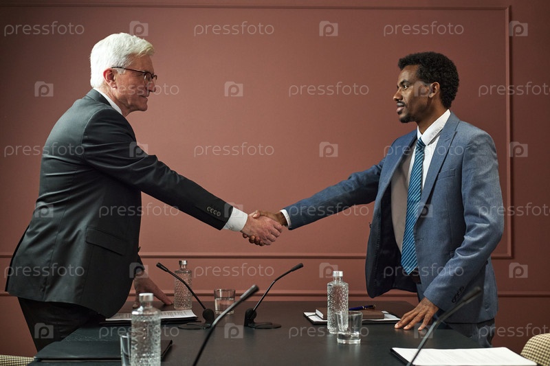 Мужчина среднего возраста и молодой взрослый чернокожий мужчина пожали друг другу руки на встрече