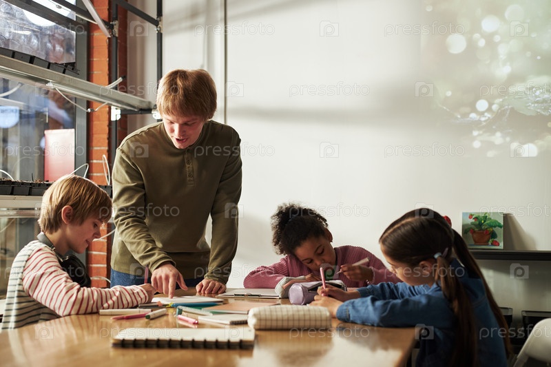 Молодой человек учит разных детей рисовать за столом в классе