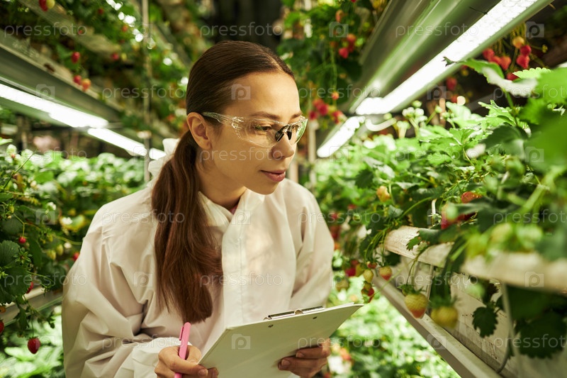 Молодая женщина наблюдает за клубничными растениями, одновременно записываясь в помещении
