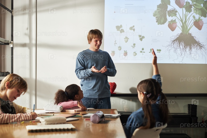 Молодой человек преподает различным детям в классной обстановке