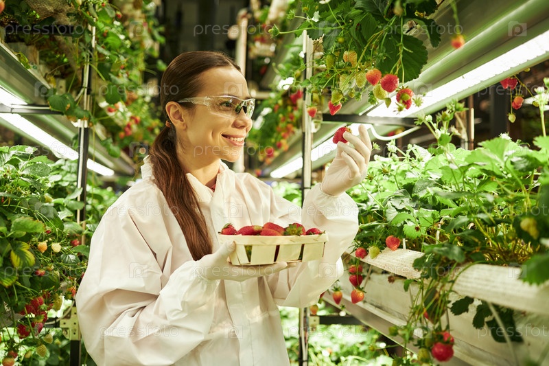 Молодая взрослая азиатская женщина собирает клубнику на крытой вертикальной ферме