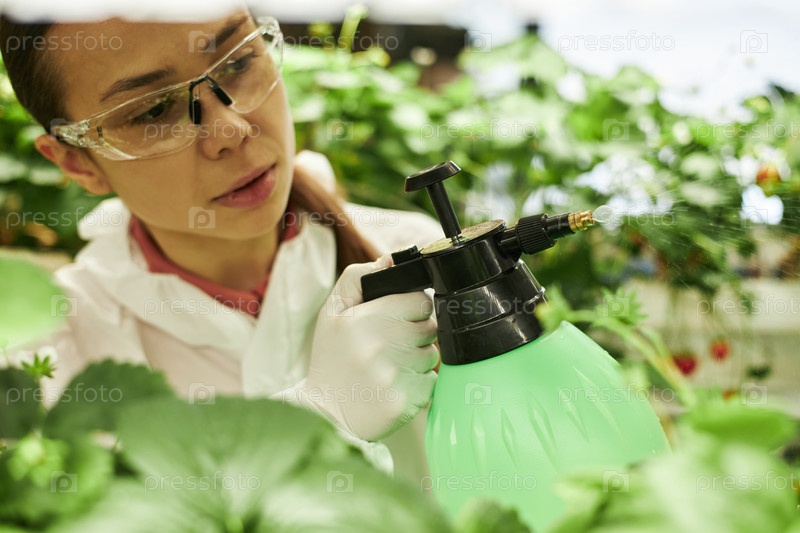 Молодая женщина опрыскивает растения пестицидом в теплице
