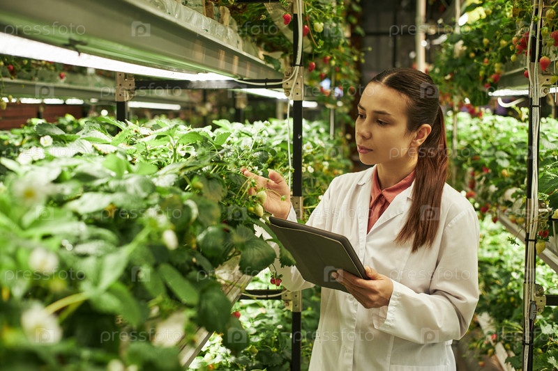 Молодая женщина оценивает здоровье клубниковых растений с помощью цифрового планшета