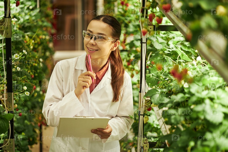 Улыбающаяся женщина анализирует клубниковые растения в тепличной среде