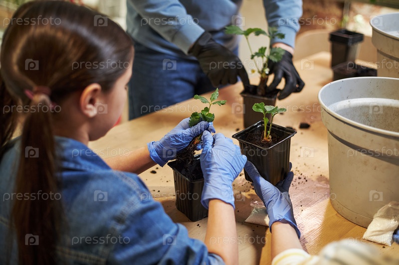 Девушка-подросток и учительница вместе сажают саженцы в помещении