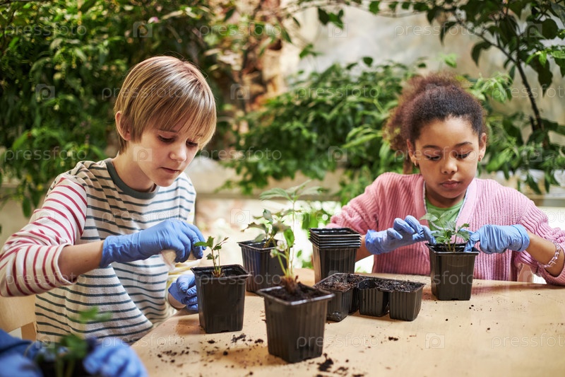 Мультиэтническая девочка и мальчик вместе сажают саженцы в помещении