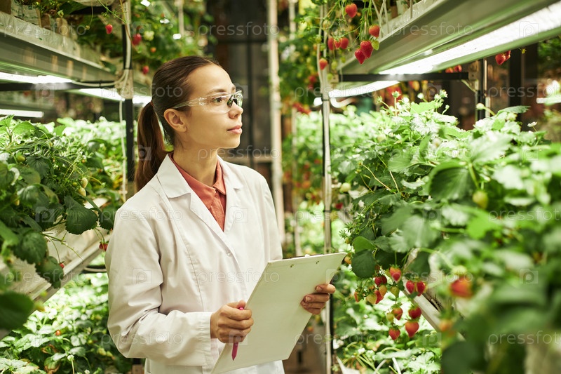 Молодая женщина наблюдает за клубничными растениями, держа в руках Клипборд внутри