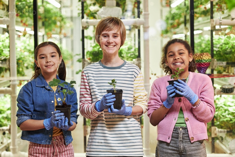 Разнообразная группа молодых детей улыбается, держа саженцы в помещении