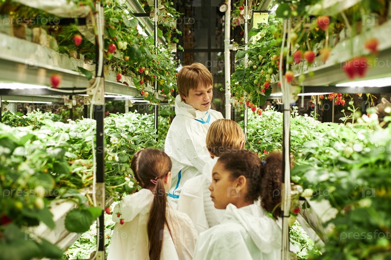 Руководство мультиэтническими детьми, исследующими крытую гидропоническую ферму Man