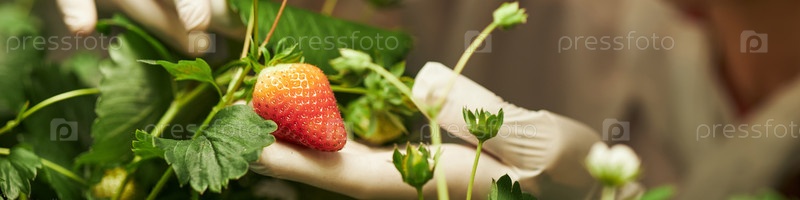 Руки анонимных рабочих собирают спелую клубнику в теплице