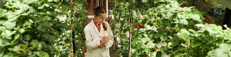 Молодая женщина записывает наблюдения в помещенной клубничной теплице