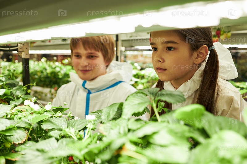 Мальчик-подросток и азиатская девушка наблюдают за растениями в теплице