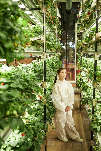 Портрет девушки, стоящей среди гидропонных клубниковых растений в помещении