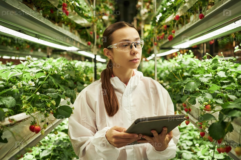 Молодая женщина осматривает клубничные растения на крытой гидропонной ферме