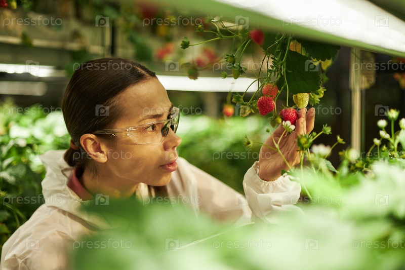 Молодая азиатская женщина осматривает созревшие клубники на крытой гидропонической ферме
