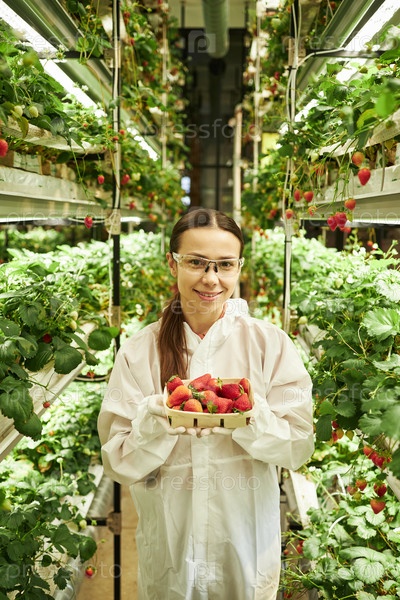 Молодая женщина собирает клубнику на крытой вертикальной ферме