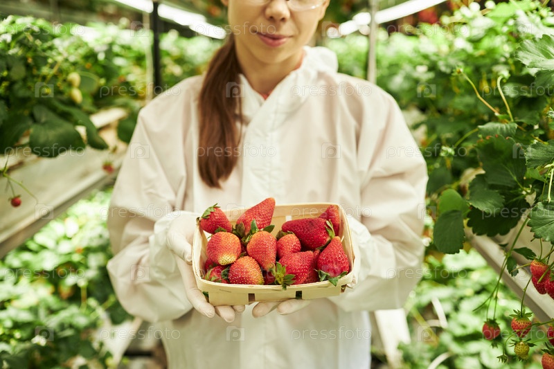Непризнанная женщина собирает свежие клубники в современной теплице