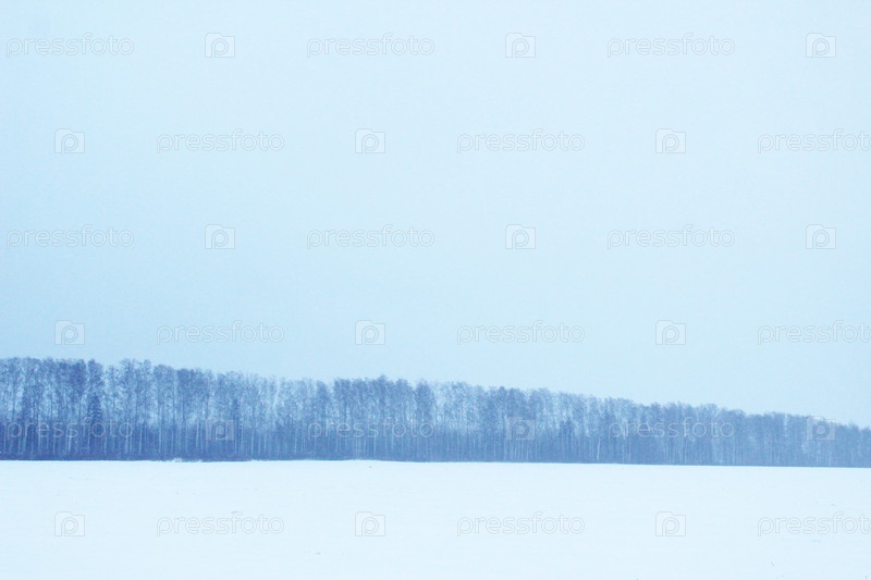 Темный лес на горизонте среди снега, красивый зимний пейзаж
