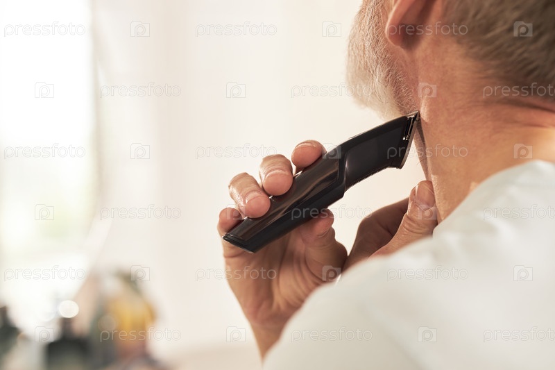 Мужчина средних лет ухаживает за волосами на шее с помощью электрического триммера дома