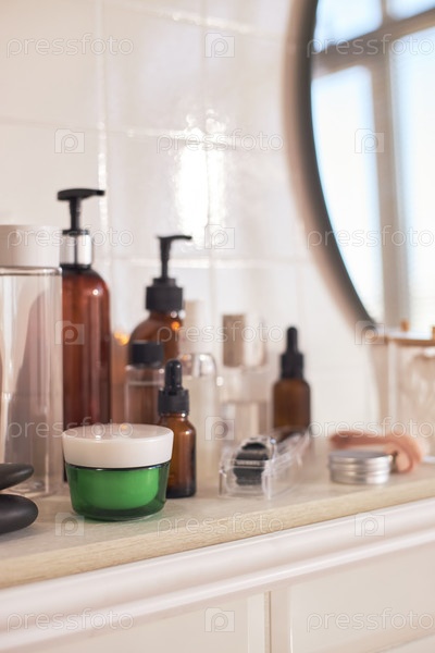 Различные продукты по уходу за кожей, расположенные на полке в ванной комнате во время утренней рутины