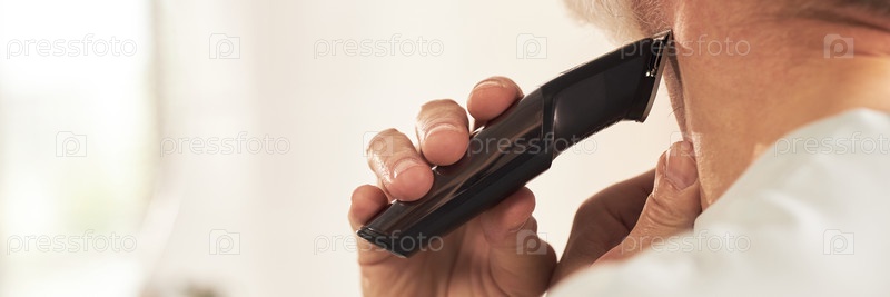 Старший мужчина ухаживает за шеей с помощью электрического триммера во время рутины по уходу за кожей