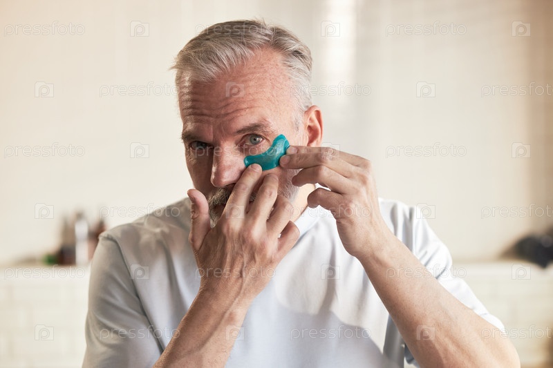 Портрет пожилого человека, наносящего пластырь для ухода за кожей под глазами в помещении