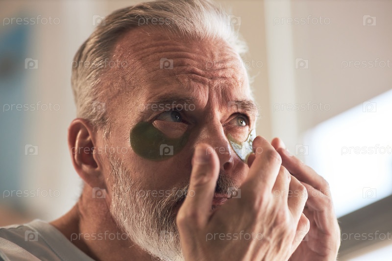 Старший мужчина корректирует зеленые глазные пятна во время рутинного ухода за кожей