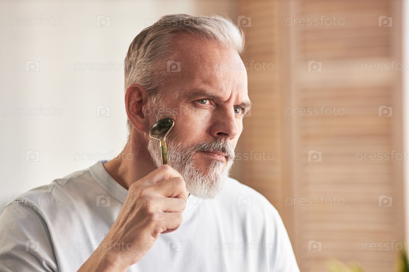 Мужчина среднего возраста, использующий ролик для лица во время процедуры по уходу за кожей