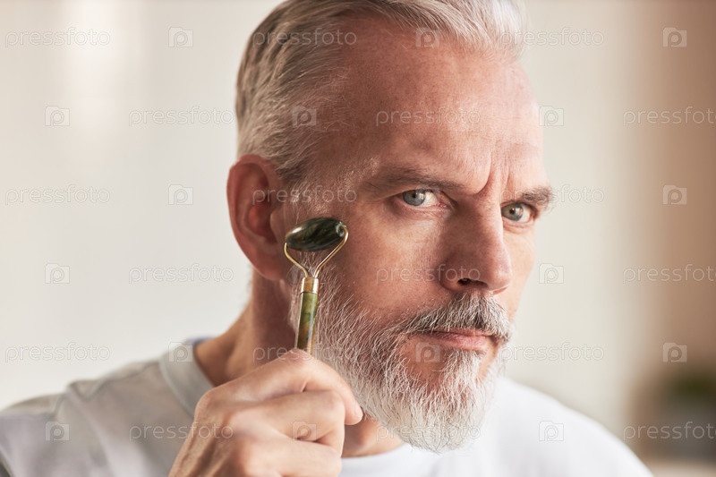 Портрет мужчины среднего возраста, использующего ролик для лица во время процедуры по уходу за кожей