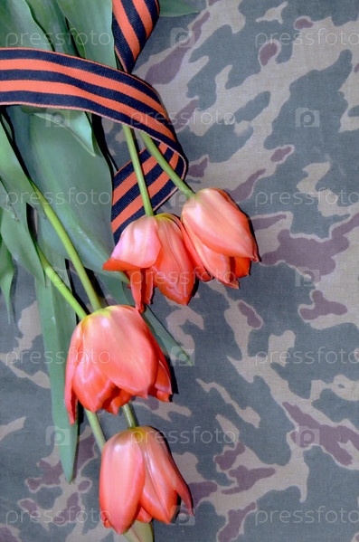 Военный фон, цветы, ленточка Святого Георгия