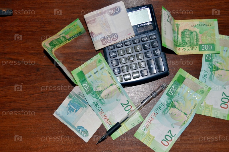 Деньги, калькулятор, ручка на темном фоне