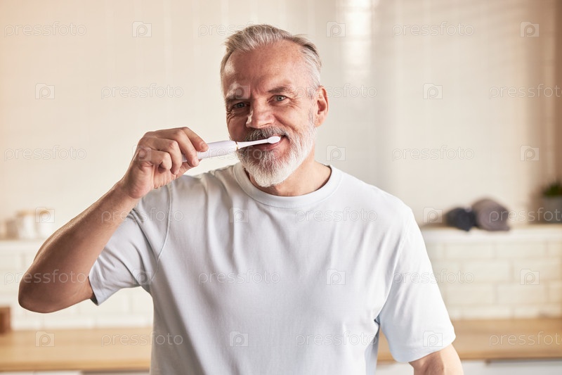 Портрет мужчины среднего возраста, чистящего зубы во время процедуры по уходу за кожей