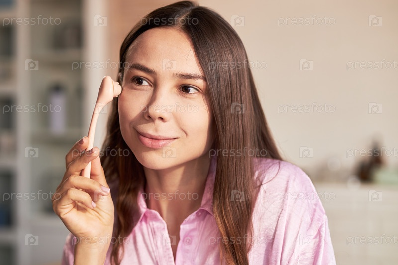 Портрет молодой взрослой женщины, использующей ролик для ухода за кожей