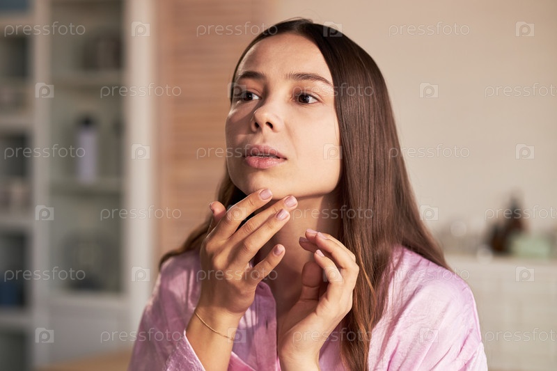 Молодая взрослая женщина осматривает кожу во время утренней рутины ухода за кожей