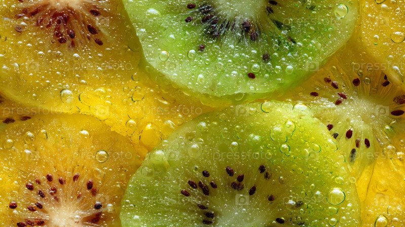 Макрофотографии зеленых и золотых кусочков фруктов киви с каплями воды. бесшовные плитки