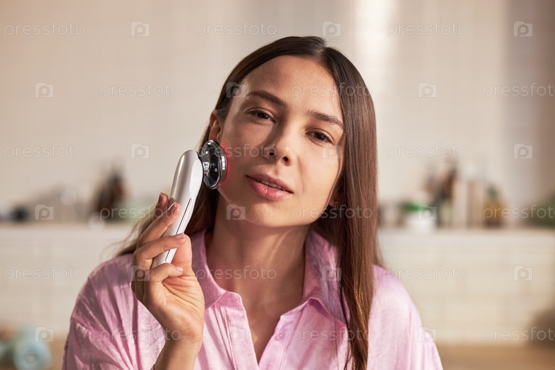 Портрет молодой взрослой женщины, использующей устройство по уходу за кожей во время рутинной работы