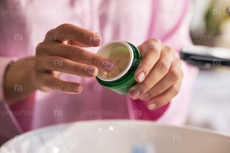 Молодая взрослая женщина наносит увлажняющий крем во время процедуры по уходу за кожей