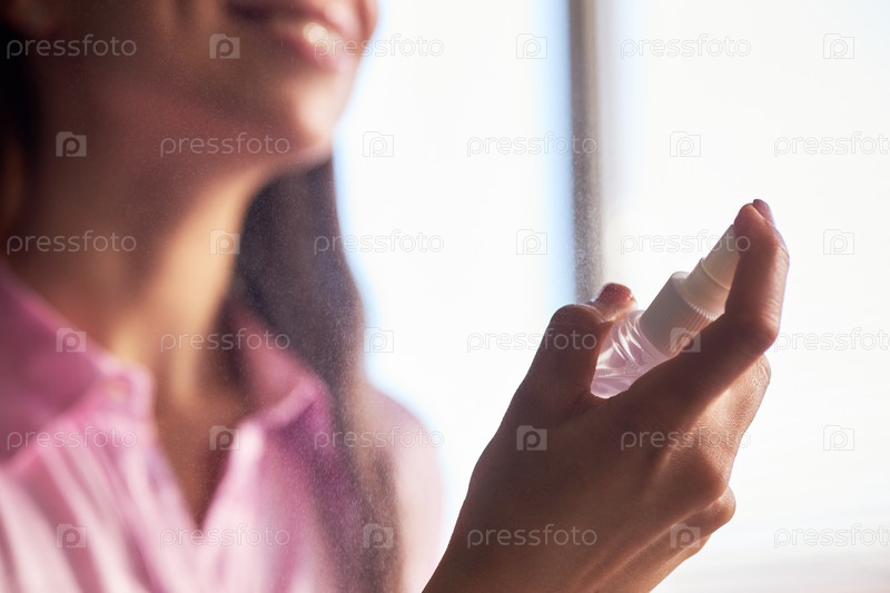 Молодая взрослая женщина распыляет лицевой туман во время процедуры по уходу за кожей