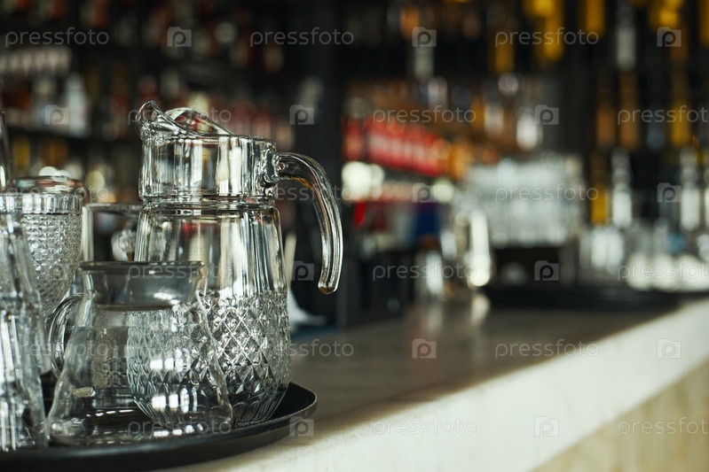 Стеклянный кувшин и чайник стоят на барной стойке в интерьере ресторана