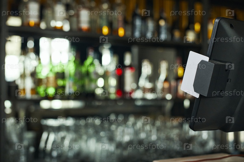 Кредитная карта, которую прокручивают через платежный терминал в банкомате Bar Counter Indoors