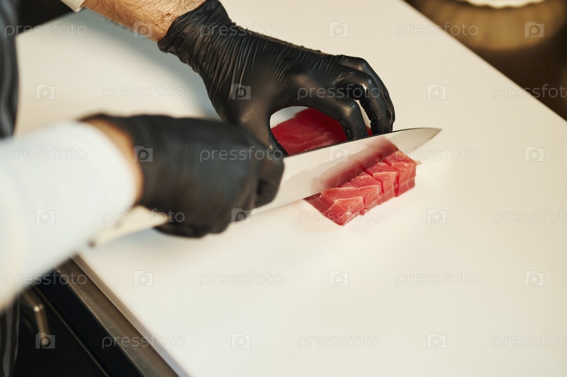 Молодой взрослый мужчина нарезает сырую рыбу ножом на доске для резки