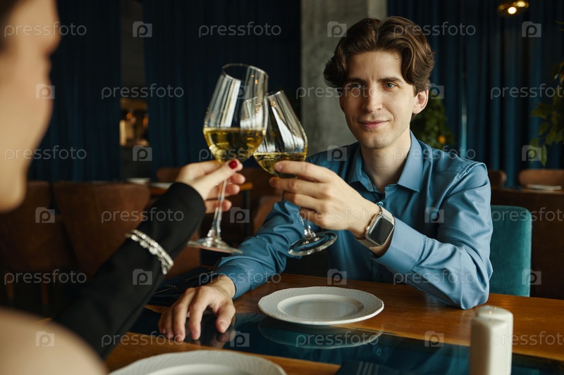 Портрет молодого человека, тостирующего бокалы вина с женщиной в ресторане