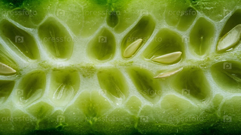 Свежий зеленый огурец разрезают, раскрывая его семена и водянистую внутреннюю структуру